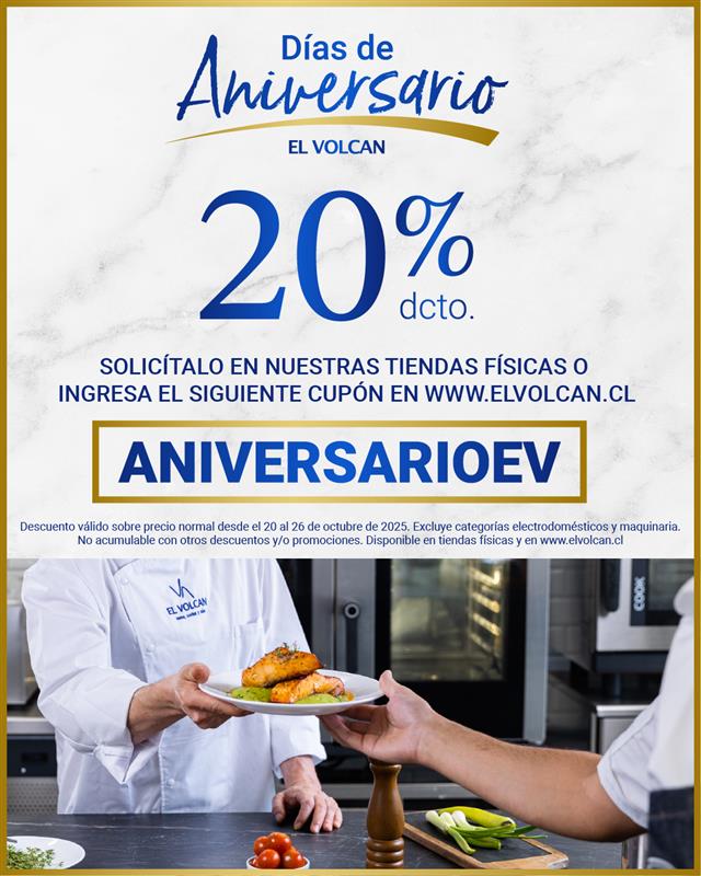¡Festejemos juntos nuestra historia! Disfruta un 20% de descuento sobre precio normal en tu próxima compra, válido en tiendas físicas y en www.elvolcan.cl con el cupón ANIVERSARIOEV (Descuento no acumulable con otras promociones o descuentos. Excluye las categorías de electrodomésticos, maquinaria y parrillas), válido del 20 al 26 de octubre 2025.