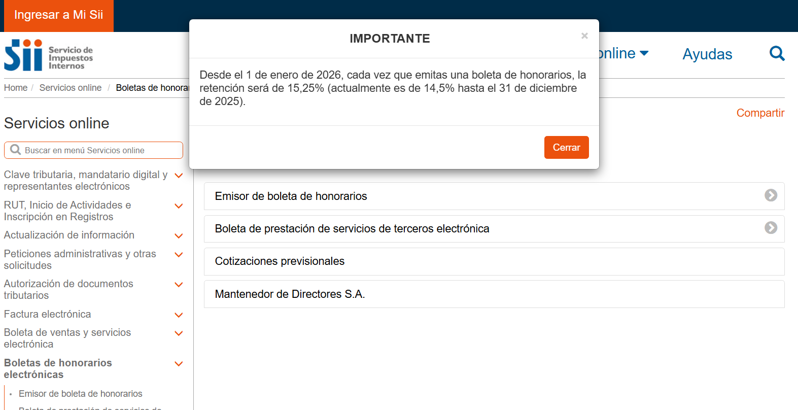 Portada » Información SII: Modificación Retención en Boletas de Honorarios a partir del mes de enero 2026: 15,25%